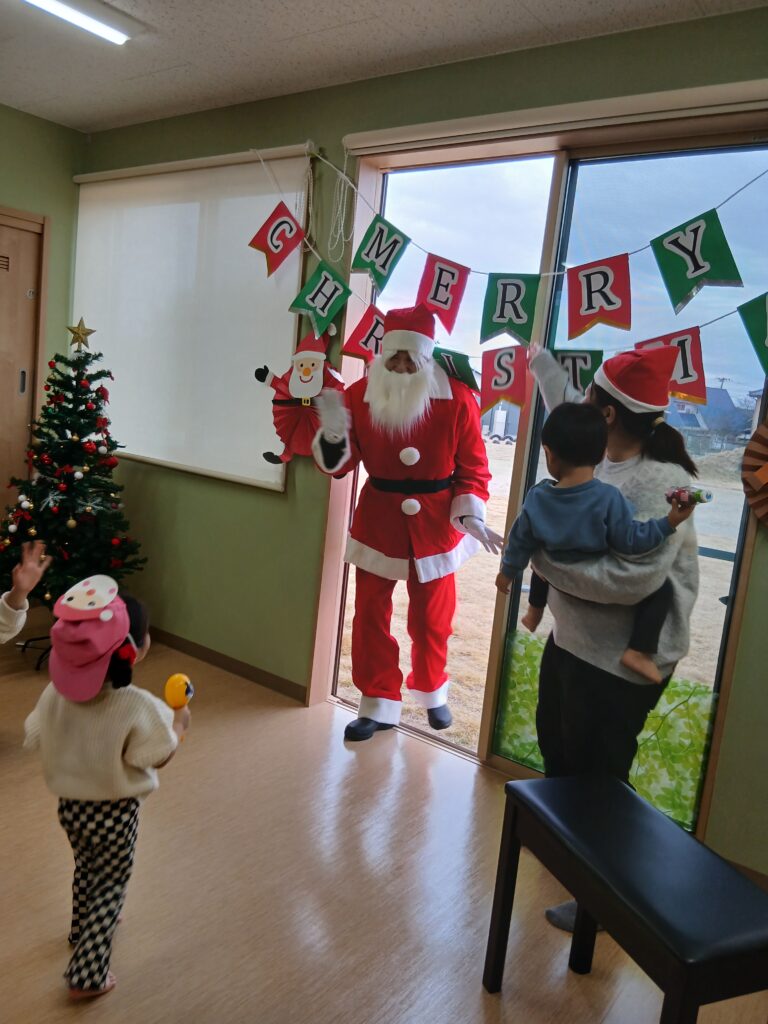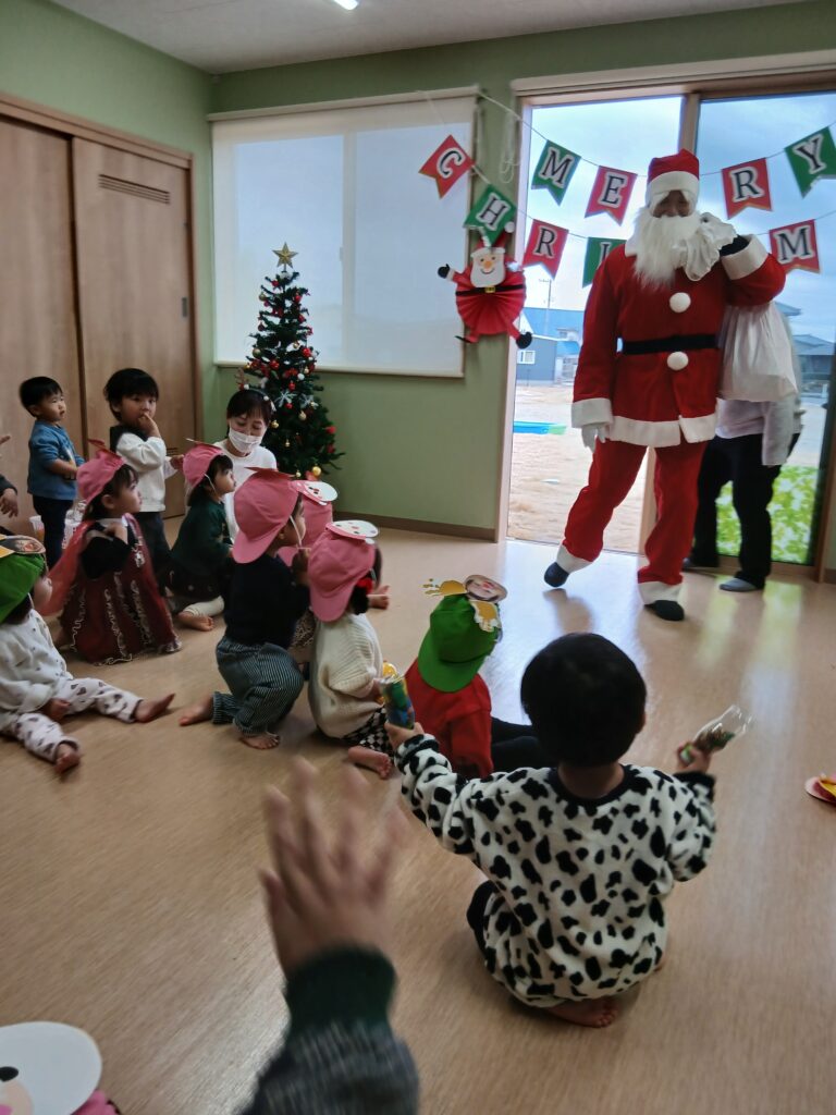 外からサンタさんがやってきましたよ!!!✨ みんなおおきなサンタさんに思わず息をのんでいました( *´艸`)・・・ちょっぴり怖くて涙を見せる子も💧💧