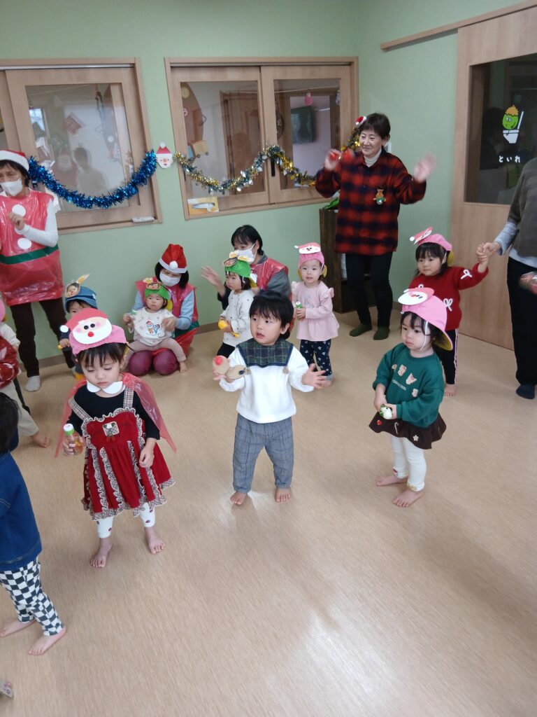 サンタさんにドキドキしている子もいたのですが、『いちごサンタクロースと踊りましょう』が始まると、みんなノリノリでサンタさんと一緒にマラカスを持って踊っていましたよヽ(^o^)丿