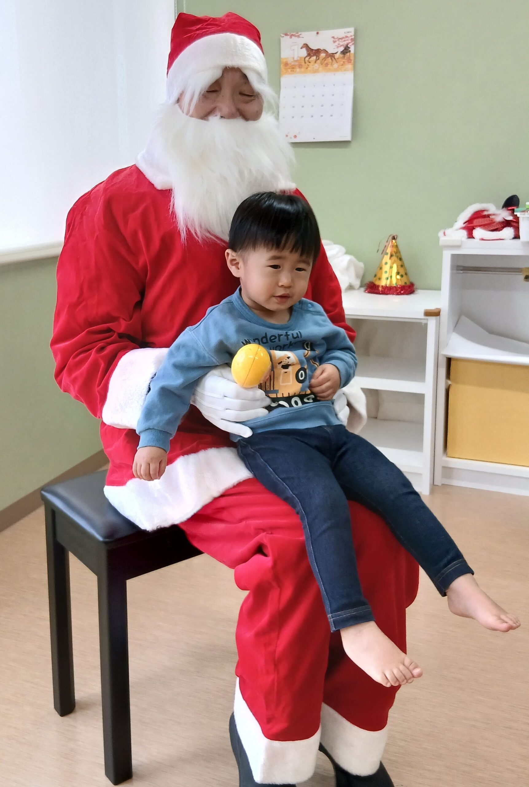 踊っていると、Sくんがサンタさんに近づいていきました(*^_^*)するとお膝の上に乗せてもらって、「はいポーズ☆彡」