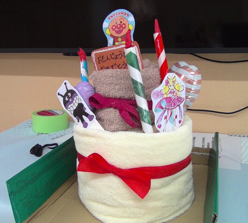 お祝いのケーキ🎂は誕生児の子どもたちが好なキャラクターで飾り付けましたよ