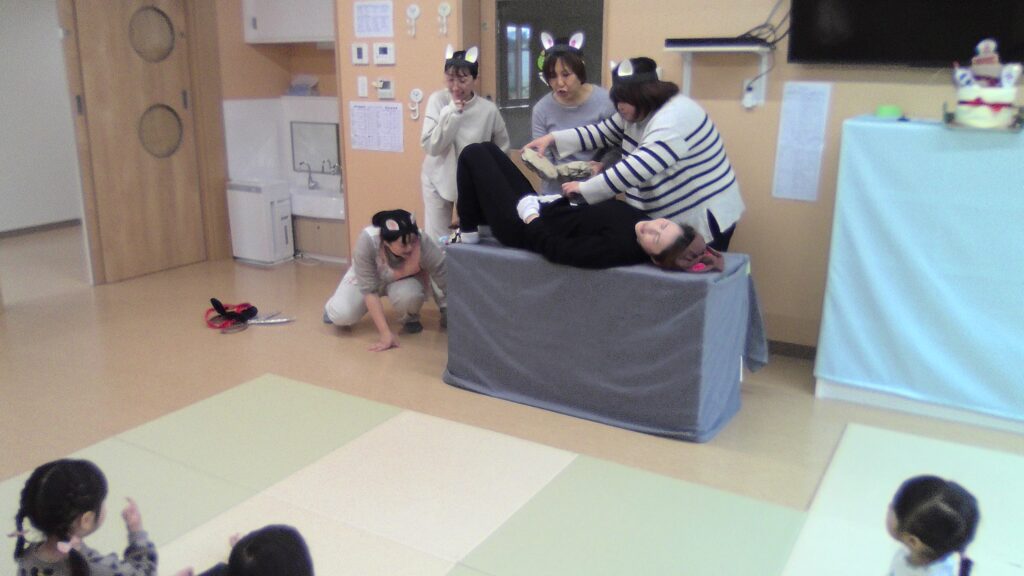らびっとクラス(1歳児)では、3匹のこぶたごっこや7匹の子ヤギごっこなどオオカミさん登場するお話が大好きなんですよ🐺