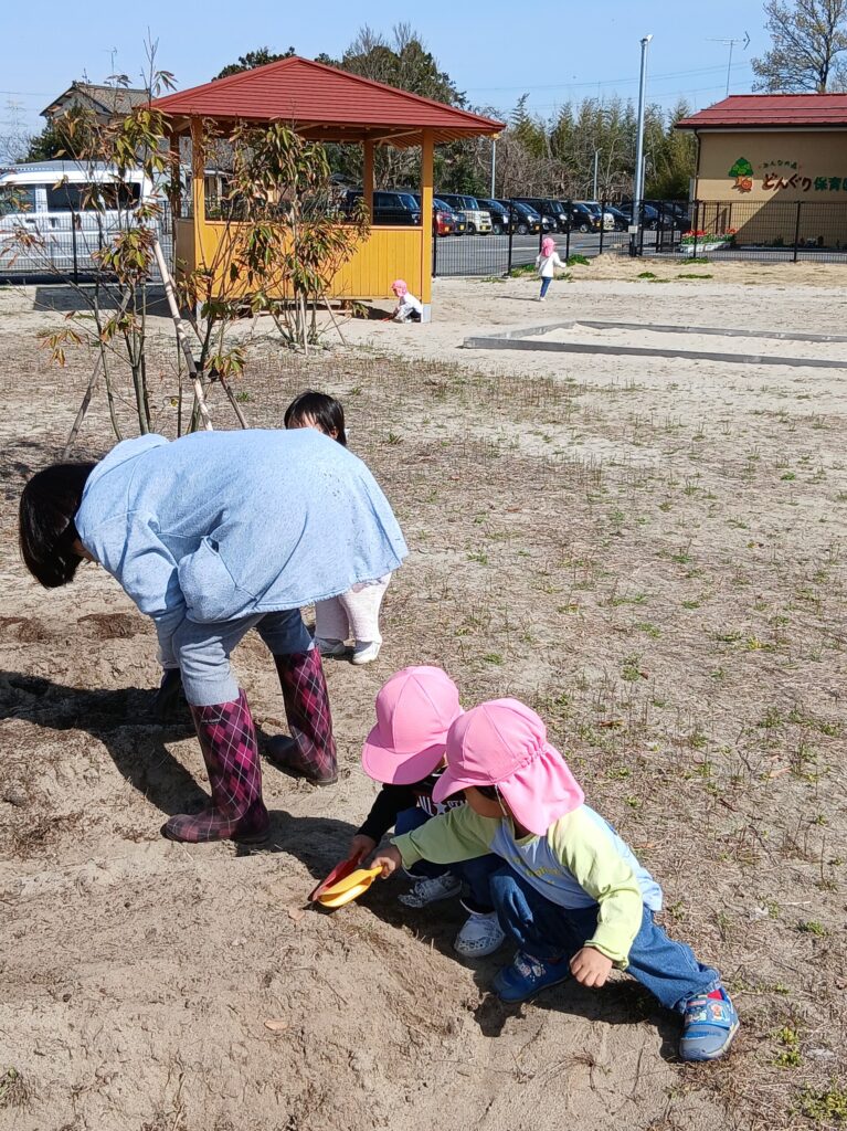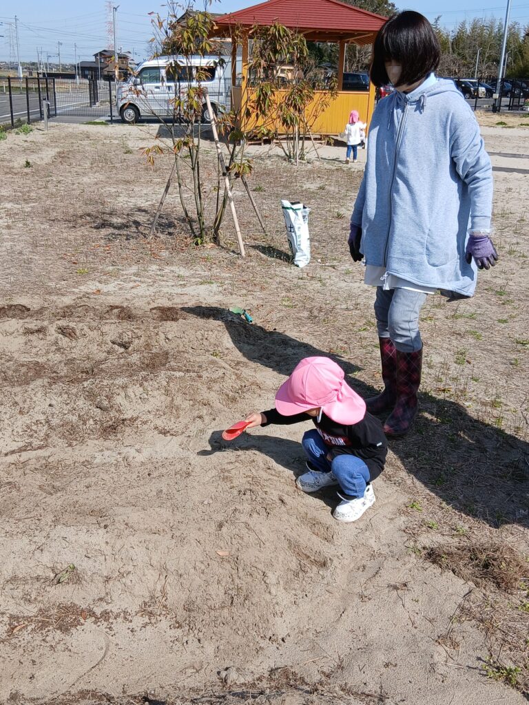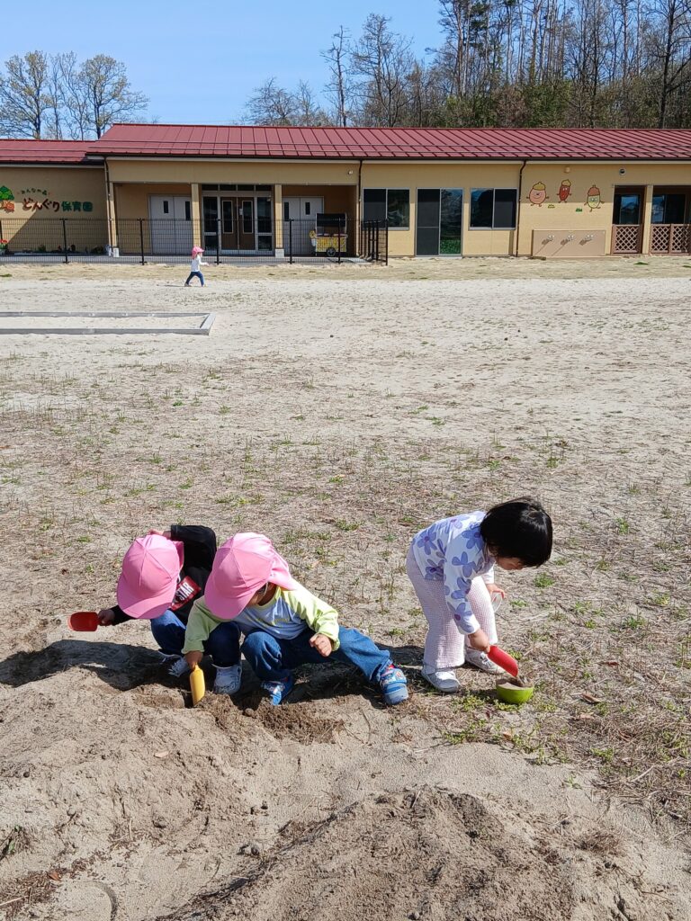 シャベルを持ったり、ままごとの茶碗を持ったり・・・砂場あそび感覚の子ども達✳✳✳