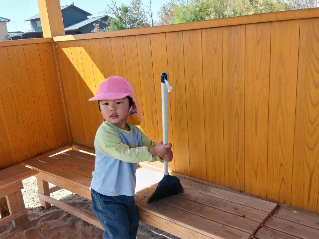 東屋のところでは・・・ほうきを持ってお掃除を頑張るR君!   大人のことをよ~く見ているんですね~(o^―^o)ニコ