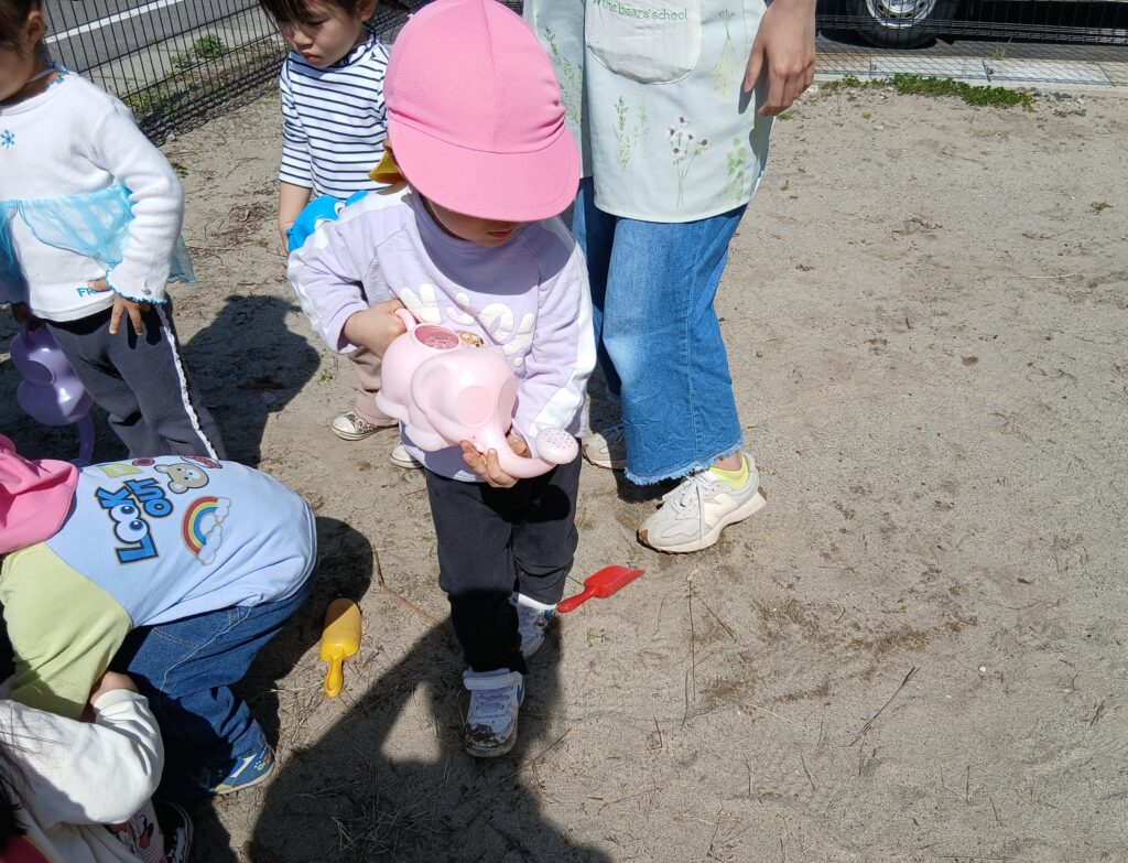 「僕もじょうろで、お水を運ぶ~」・・・ゆっくり、ゆっくり、こぼさないように、こぼさないように・・・慎重に慎重に運ぶ子ども達。(誰が言ったわけでもないのに、子ども達はこぼさないように歩いたんですよ🍃)